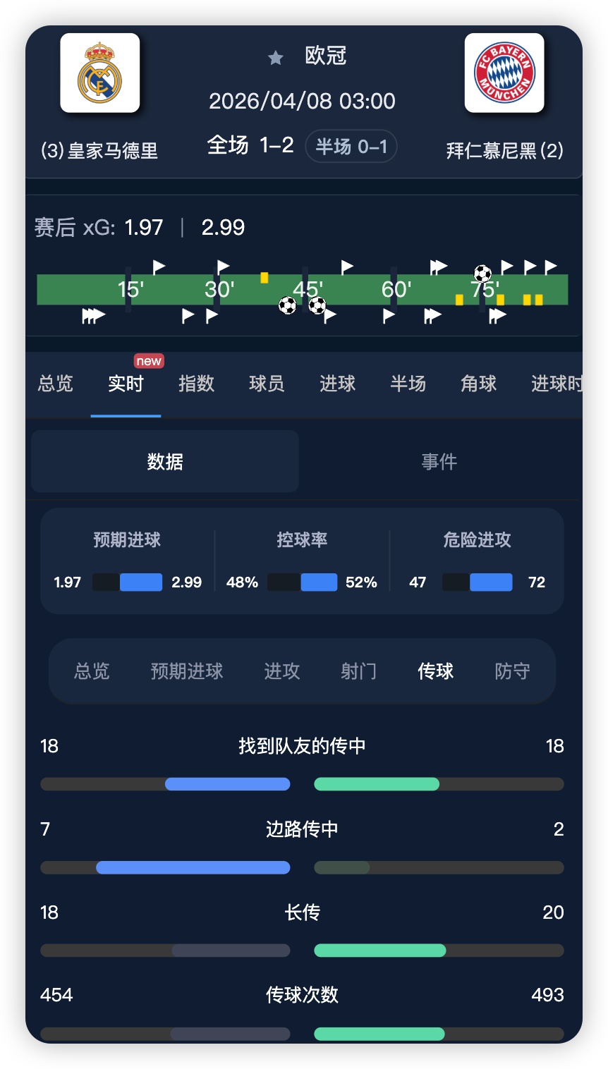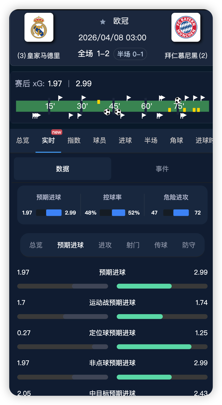 鸟叫足球数据新增实时xG、运动战xG、绝佳机会、对方禁区内触球、边路传中等高阶实时统计数据。