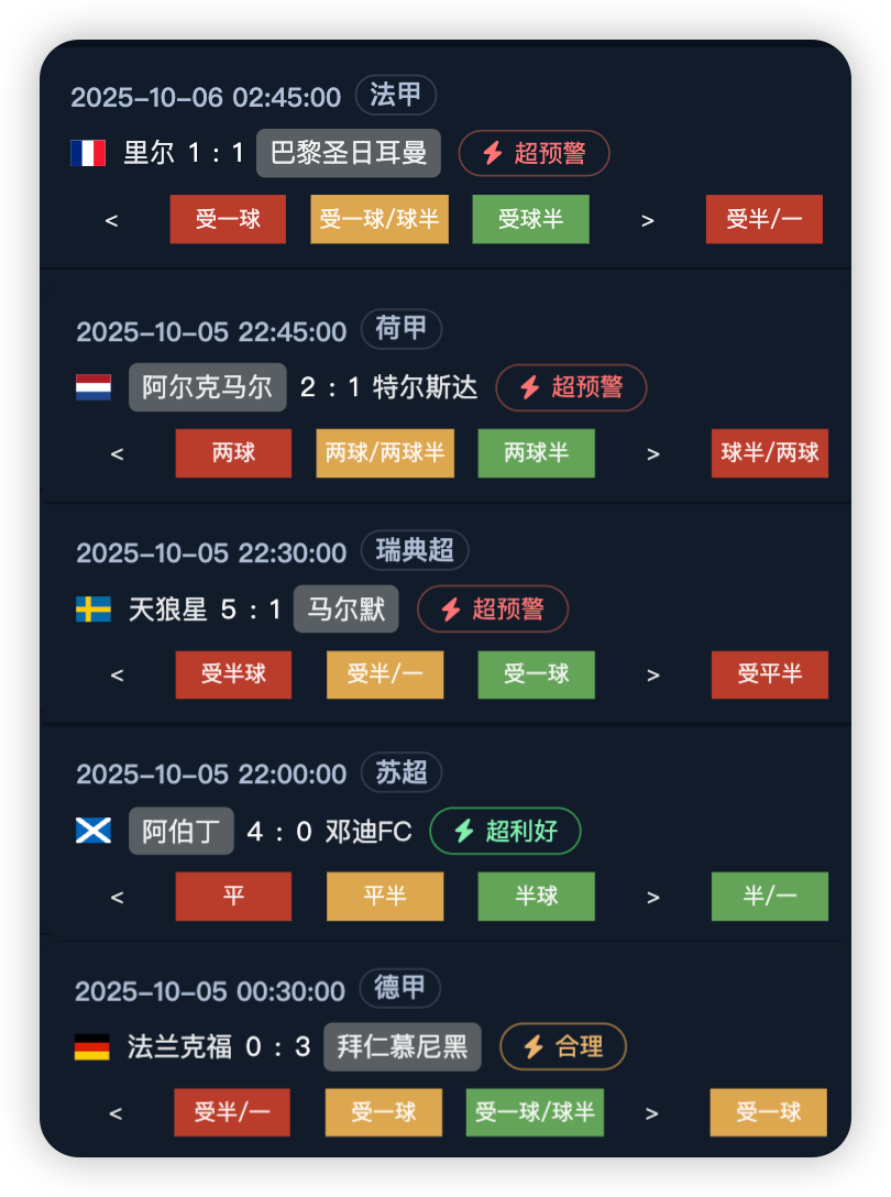 我们的系统会根据👑的初指数据,给优势方(通常指让球方)打上一个明确的“标签”,助你快速判断风向: